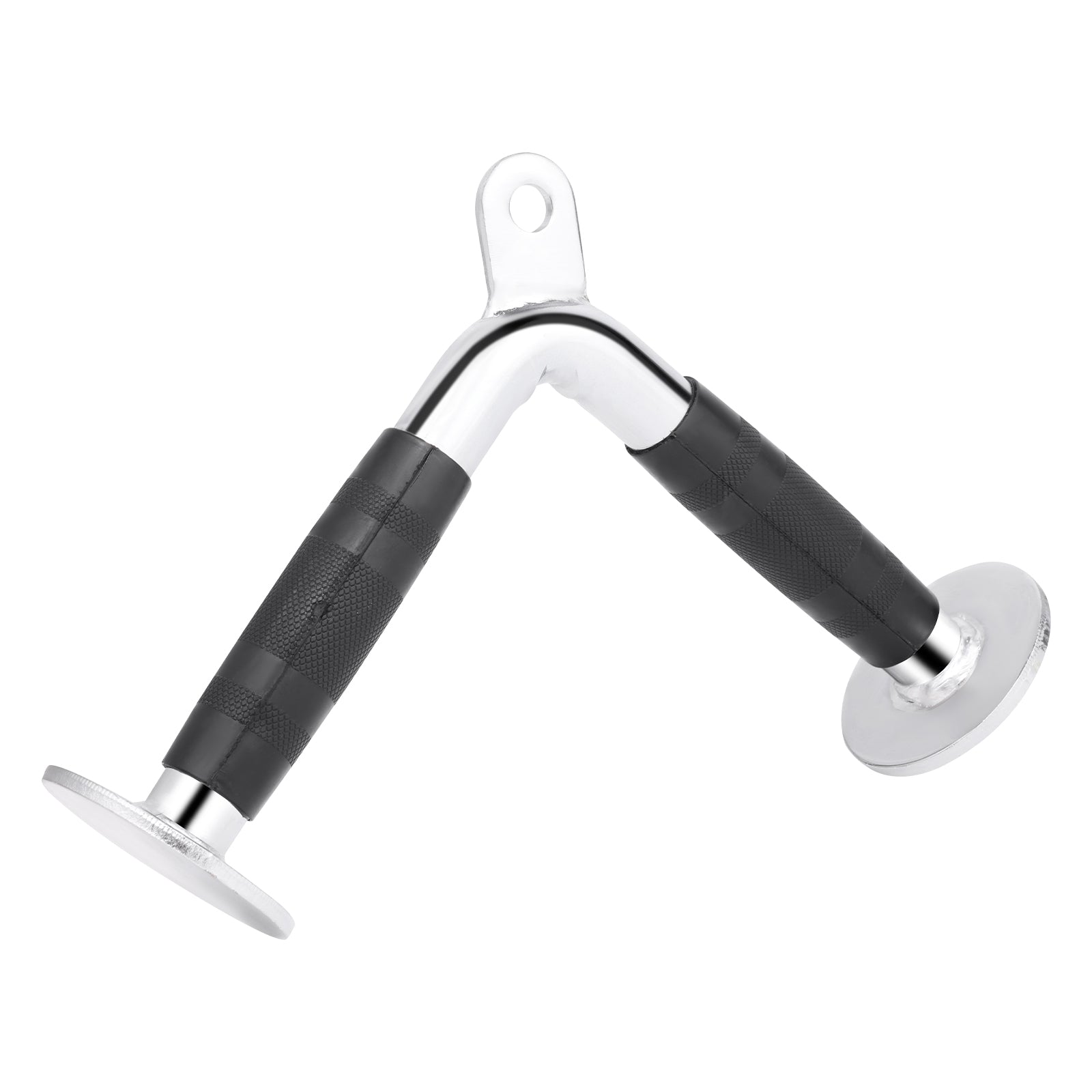 Fabricado con un acabado cromado de alta calidad y antideslizante, este agarre garantiza un rendimiento excepcional y seguridad adicional, ayudando a prevenir deslizamientos durante los ejercicios. Su diseño en forma de "V" permite un agarre natural, maximizando la eficiencia en tus entrenamientos.